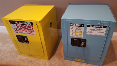 The first pieces of my new lab have arrived: real, heavy-duty lab safety cabinets for flammables and corrosives!